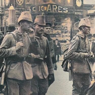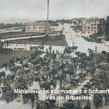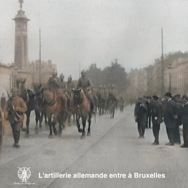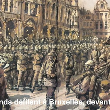 Il a fallu une dizaine de jours aux Allemands pour rallier Bruxelles et l'occuper. Drapeau en tête, au son de ses fifres, l'ennemi défile sur la Place de l'Hôtel de Ville, pratiquement déserte. L'infanterie était suivie de l'artillerie.
