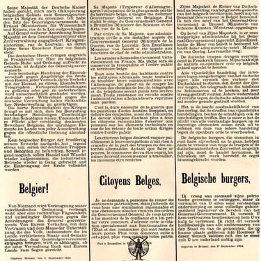 Le 2 septembre 1914, le Feldmarshall von der Goltz fait placarder une affiche sur les murs de Bruxelles appelant les citoyens de cette ville à l'obéissance et au respect des troupes allemandes.