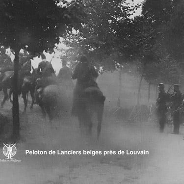 La cavalerie belge, constamment au contact de l'ennemi, s'épuise à ralentir l'avance progressive de celui-ci. Ce peloton de lancers (2ème photo), que l'on voit partir au galop d'une route barricadée près de Louvain pour battre l'estrade, devait engager la fusillade quelques minutes plus tard.