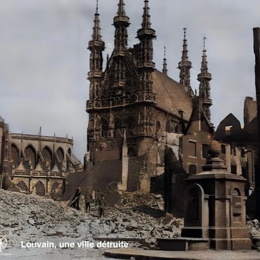 L'armée belge, amoindrie, doit résister à l'attaque des Allemands à Louvain du 24 au 26 août 1914. L'inestimable richesse de la bibliothèque universitaire de la ville part en fumée...