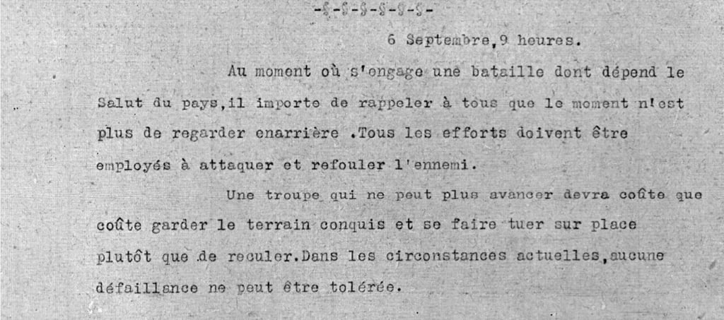 L'ordre du jour signé Joffre enjoint aux régiments de déployer tous les efforts nécessaires pour empêcher l'ennemi d'avancer. L'ordre du jour du 6 septembre 1914 enjoignit à tous les soldats de ne pas reculer et de ne pas hésiter à utiliser la baïonnette contre l'ennemi.