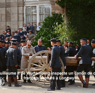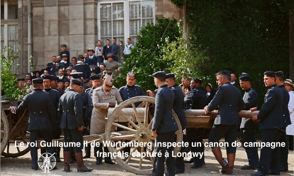Alors que de plus en plus de canons capturés arrivent en France, il est certainement intéressant d'en savoir plus sur cette arme, véritable pilier de l'armée. En France, le canon et les wagons de munitions forment toujours une unité cohérente, la « pièce », qui se tient côte à côte, même au combat. Le canon est attelé à l'extrémité de la queue de l'affût, munie d'un solide éperon et longue de 4 mètres ; le canon seul mesure 2,25 mètres de long et possède un calibre de 75 mm. Le bouchon vissé à l'extrémité n'est pas conçu pour se rétracter, mais pivote à 180 degrés pour libérer l'âme. Lors du tir, le canon coulisse vers l'arrière sur le rail de coulissement grâce à trois paires de galets ; la forte compression du frein à air comprimé qui en résulte le repousse vers l'avant, sur la ligne de tir. Le réglage en hauteur et en largeur s'effectue par des molettes en laiton montées sur les côtés. Les boucliers en acier à droite et à gauche sont reliés au-dessus du canon ; en dessous, un volet comble l'espace entre eux si nécessaire. Les freins de roue sont rabattus lors du tir et servent alors de freins. L'affût de munitions est incliné vers l'arrière lors de l'utilisation, ce qui permet d'ouvrir le couvercle comme une porte à deux battants et de retirer facilement les 72 obus qu'il contient. 24 autres sont stockés dans l'avant-train. Un seul éclat d'obus pèse 7,24 kg et contient 292 balles. Une grenade chargée de mélinite pèse 5,3 kg. Le canon non blindé pèse 1 140 kg, et armé 1 950 kg, soit un poids nettement supérieur à celui de la version allemande. L'affût de munitions rempli de grenades pèse 1 160 kg, et celui rempli d'éclats d'obus 1 310 kg. Les équipages sont transportés non pas sur des sièges d'essieu, mais sur des avant-trains et des affûts de munitions. La récupération de ce butin de guerre est une tâche laborieuse, car les canons doivent être arrachés du champ de bataille, où l'ennemi les a abandonnés, par nos troupes, souvent sur des kilomètres jusqu'à la voie ferrée la plus proche.