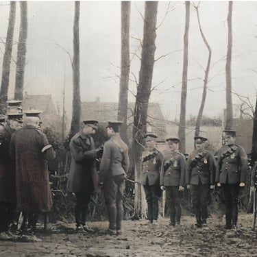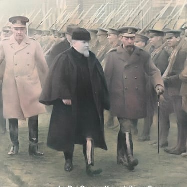 Venu pour soutenir le moral de ses troupes et les encourager à poursuivre la lutte, le Roi George V rend ainsi hommage à ses valeureux soldats. Le soir de sa visite en France, un dîner réunissait le Roi, le président et le prince de Galles au quartier général du maréchal French.