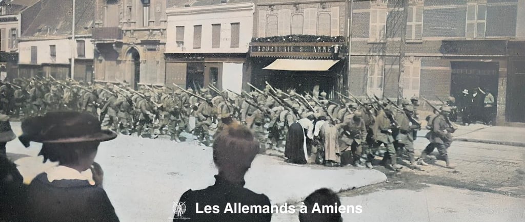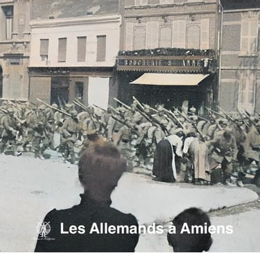 Image : L'infanterie allemande remonte la Rue Jules Barni à Amiens, en direction de Paris. Elle devait suivre le même chemin dis jours plus tard dans le sens inverse. Mais avant d'évacuer la capitale de la Picardie, l'ennemi a pris le temps de réunir à la citadelle les hommes valides de la ville et d'en emmener 1200 d'entre eux en captivité.